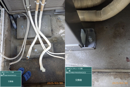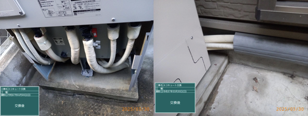 続いて新しいタンクとヒートポンプを運び込み、それぞれに配管や配線を繋ぎ合わせます。今回はタンクとヒートポンプの位置が離れているため、長いタイプの配管にカバーをしてきれいに仕上げます。