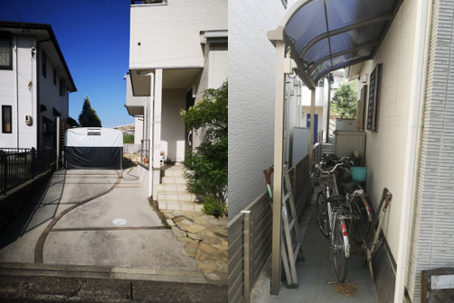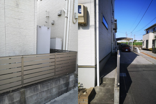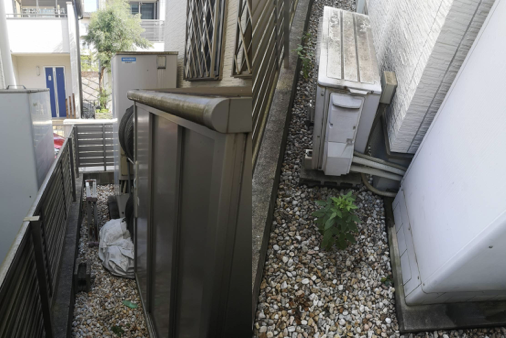 設置場所の周囲はフェンスで囲まれていて狭いうえ、タンクの手前にある物置きが障害物となって手前からタンクを運び出すことはできません。反対側からの通路も狭く、ヒートポンプがギリギリ置ける程度の幅しかないため敷地内で搬入経路を確保するのは困難です。