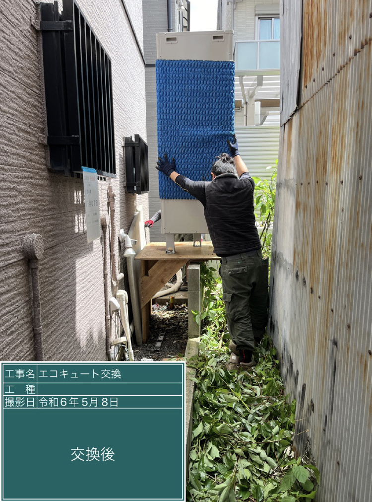 埼玉県ふじみ野市で行った工事では、狭小スペースに設置されたエコキュートを交換するためブロック塀の外側に足場を作成。タンクを真上に持ち上げて塀を乗り越える形で搬出入を行い、三菱の「SRT-S465U」を設置しました。
