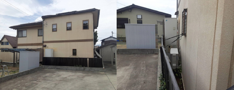 福岡県筑後市でも、エコキュートから突然お湯が出なくなってしまったというお問い合わせを頂いて、すぐに駆けつけ対応しました。家屋周りからは搬入経路を確保できなかったため、フェンスを外して隣家の駐車場からタンクを搬出入。ダイキン「EQ46MBFV」からパナソニック「HE-SU46LQS」に交換しました。