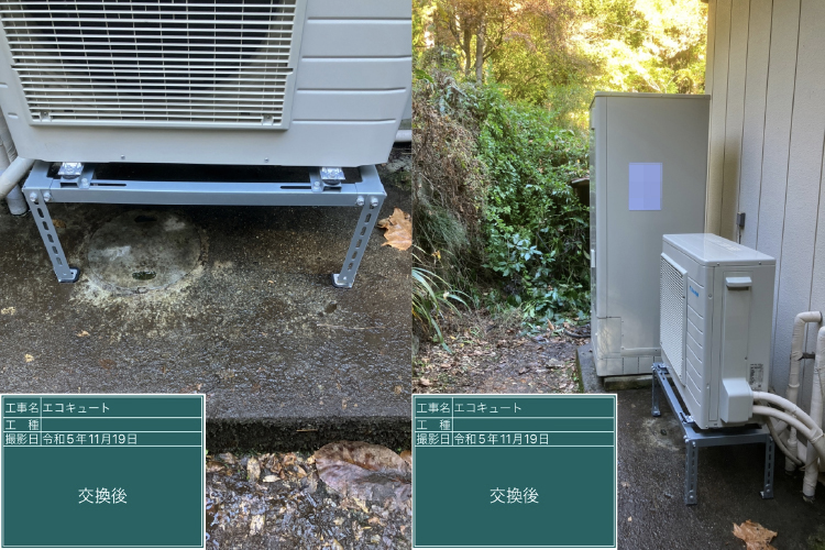 標高の高い高原都市として知られる山梨県富士吉田市では、寒冷地仕様のエコキュートの交換を行いました。既設のエコキュート(サンヨー「SHP-TC37G-K(寒冷地仕様)」)を撤去。積雪対策としてヒートポンプに架台を新設してダイキン「EQ37WFHV(寒冷地仕様)」を設置しました。