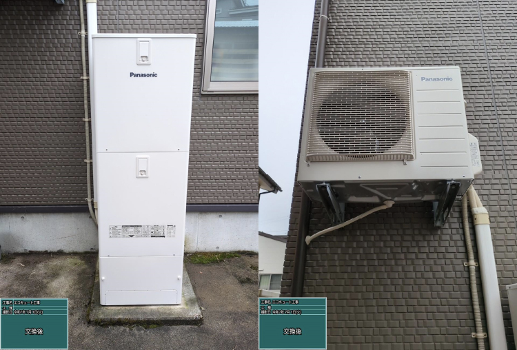 福井県敦賀市では、セミオートタイプのエコキュート(パナソニック「XHE-46K3SUS」)を撤去してフルオートタイプのエコキュート(ダイキン「EQ37VFV」)へ交換しました。同エリアは冬になると1m以上積雪するということもあり、ヒートポンプが雪で覆われてしまわないように本体が嵩上げ設置されています。
